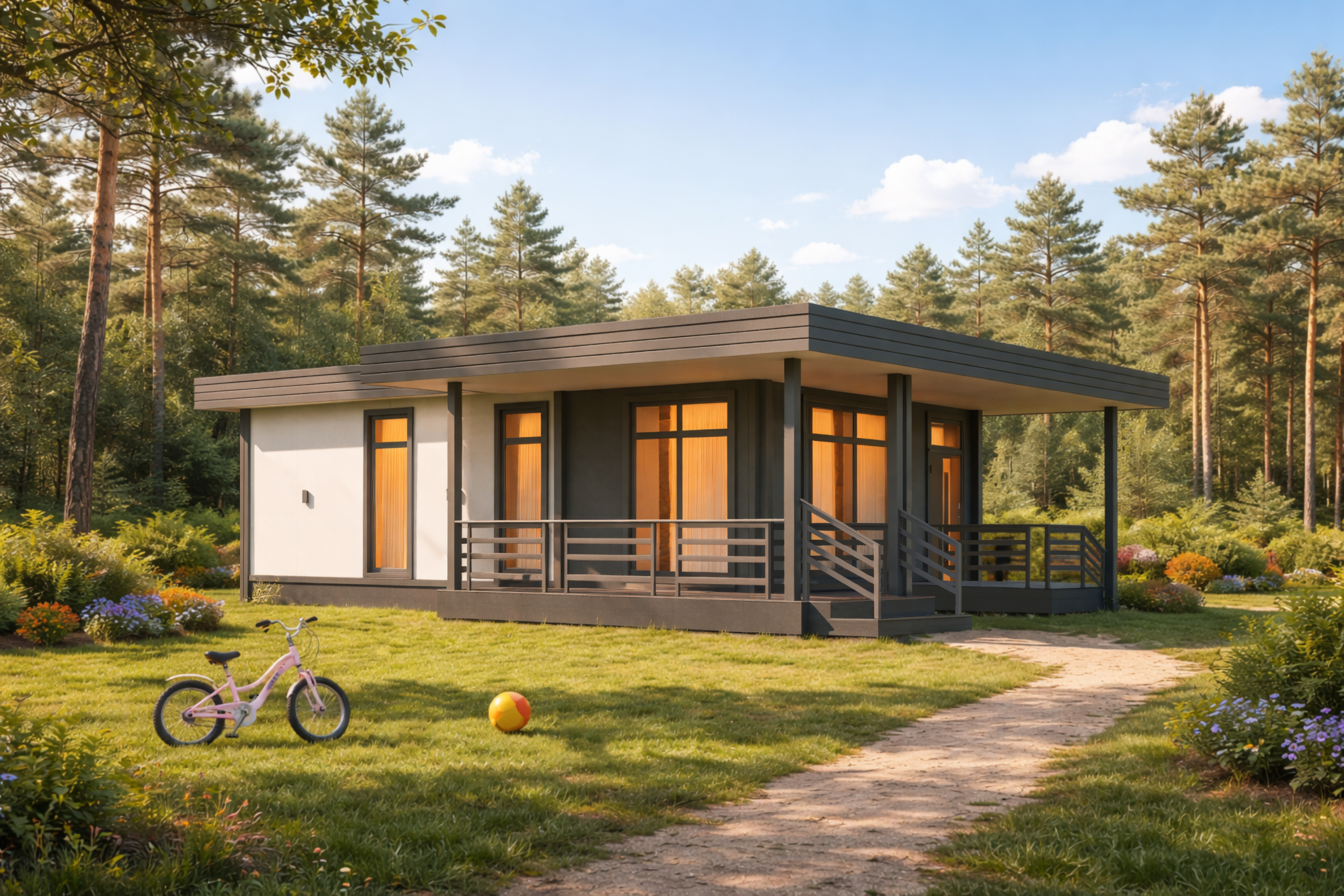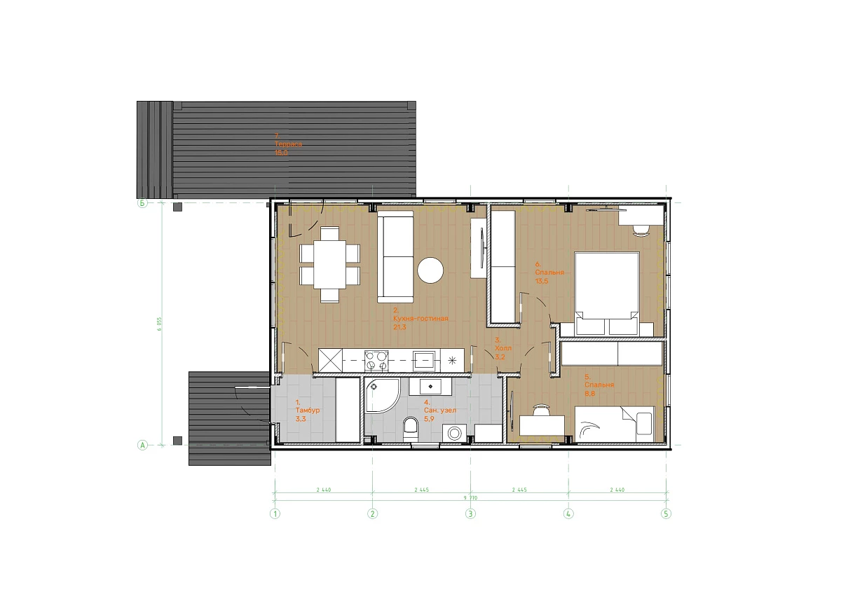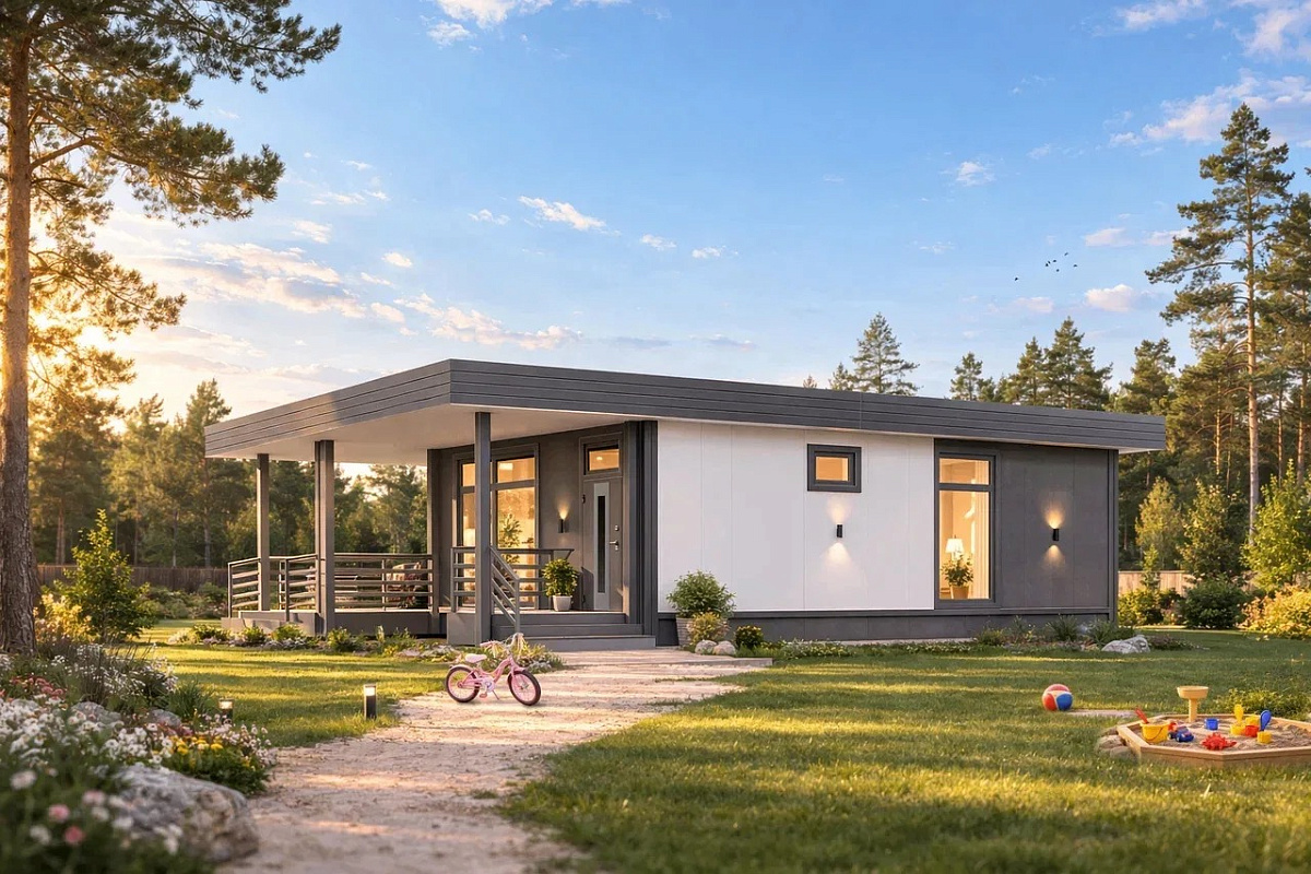 Домокомплект DOORHAN 88 ПРО — это дом, который идеально подходит для молодой семьи. Вторая спальня может стать удобным кабинетом, а с появлением первого ребенка в доме — отдельной детской комнатой. Общее пространство останется центром жизни, но у каждого будет и свое уютное место.